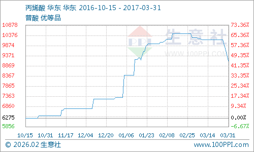 2017年2月份价格整体平稳运行。2月丙烯酸市场行情整体平稳,卫星石化丙烯酸报价执行普酸承兑价价格10000元/吨,实单价9800元/吨,2017年2月20日开始停车检修,三月初装置恢复重启。齐鲁石化开泰股份有限公司当前普酸价格10500元/吨,2017年2月中旬开始停车检修,2月25日样子恢复重启。江苏裕廊化工有限公司普酸报价10800元/吨,主供老客户和合约客户。