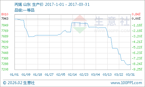 产品:国内丙烯价格便开启下行通道,山东市场主流成交在7100-7150元/吨,在十个工作日内下跌了600元/吨,可以说近日价格在创造17年的一个一个的新低点。