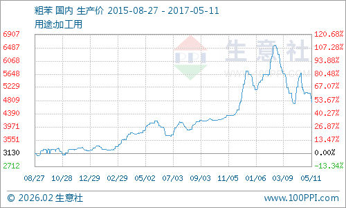 根据生意社国内粗苯样本价格走势显示,截止周四(5月11日)粗苯价格为4687.33元/吨,较上周跌310元/吨,跌幅为6.20%。