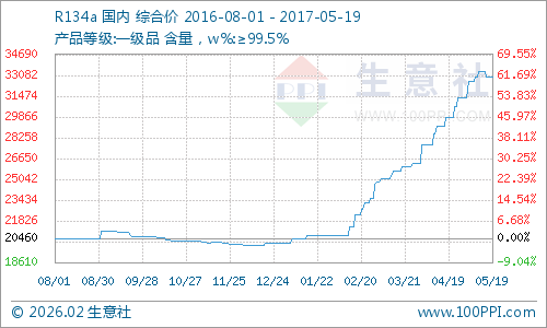 根据生意社价格监测,本周国内R134a制冷剂市场高价维稳,市场主流生产厂家出厂报价均价32950元/吨,与去年同期同比上涨65.91%。