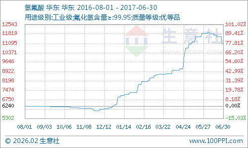 据生意社监测数据显示,2017年上半年无水氢氟酸市场呈现大幅上涨态势,年初主流厂家均价为6366元/吨,截至6月末价格为11090元/吨,涨幅74.19%。