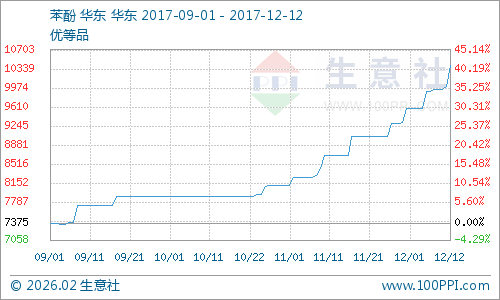 据生意社大宗榜数据显示,截至目前生意社监测国内厂家出厂价为10300-10500元/吨,石化厂家挂牌主流在10500元/吨,12日单日调涨500元/吨,涨幅3.88%;本月上涨8.64%,自国庆节后整体涨幅31.85%;苯酚市场一路上行,连涨不断,创三年内新高。