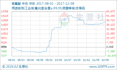行业:2017年下半年空调行业产量增加,上游原料萤石和氢氟酸市场货源供应正常,氢氟酸市场价格小幅走高。