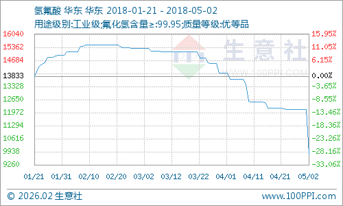 据生意社监测数据显示,5月初国内氢氟酸大幅走低,当前价格为9825元/吨,较4月初价格14008元/吨大幅下滑29.86%,同比下滑8.33%。