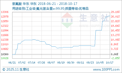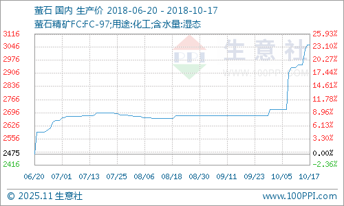 10月17日氟化工原料市场走势暂稳,萤石市场走势维持高位,其他产品价格走势稳定。原料萤石价格价格为3058.33元/吨,近期国内部分萤石装置停车,场内矿山和浮选装置停车检修,场内萤石供应相对减少,萤石价格价格走势上涨。南方萤石市场装置开工方面也有所减少,场内萤石供应正常,南方地区萤石市场价格走高。截止17日国内内蒙古地区萤石价格在2900-3100元/吨,福建地区萤石商谈主流在2900-3200元/吨,河南地区萤石价格在3000-3200元/吨,江西地区萤石价格在3000-3300元/吨,萤石价格维持高位。
