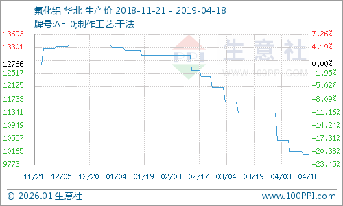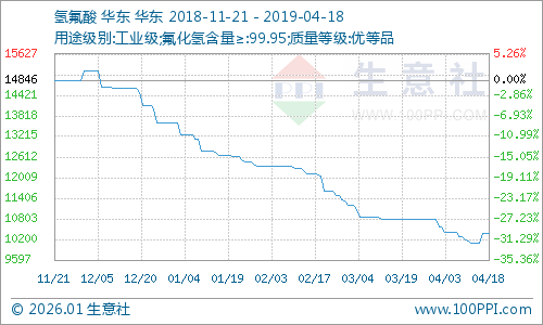 2019年4月18日氟化工价格涨跌榜中上涨的商品共1种,下跌的商品共0种,涨跌为0的商品共5种。上涨的主要商品包括:氢氟酸(0.08%);平稳的产品包括:萤石、氟化铝、冰晶石和三氯甲烷。