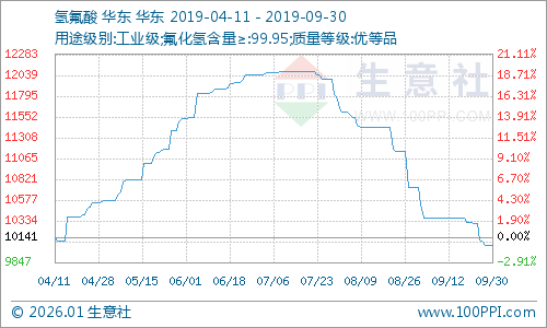 行业:9月份上游萤石和氢氟酸行业装置开工正常,氢氟酸场内产品现货供应充足,氢氟酸市场价格走势下滑。