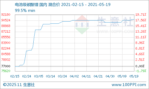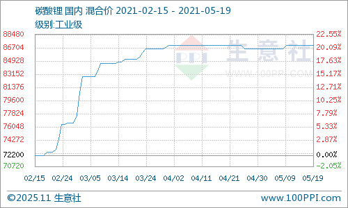 据生意社数据监测:本周工业级碳酸锂价格处于平稳状态,电池级碳酸锂价格则稍有上探。5月19日工业级碳酸锂华东地区均价价格为87000元/吨,与周初(5月16日工业级碳酸锂华东地区均价价格为87000元/吨)相比价格保持平稳。5月19日电池级碳酸锂华东地区均价价格为90800元/吨,与周初(5月16日电池级碳酸锂华东地区均价价格为90600元/吨)相比价格上涨了0.22%。19日,工业级碳酸锂市场综合报价在82000~90000元/吨附近,电池级碳酸锂市场综合报价在85000~92000元/吨附近。