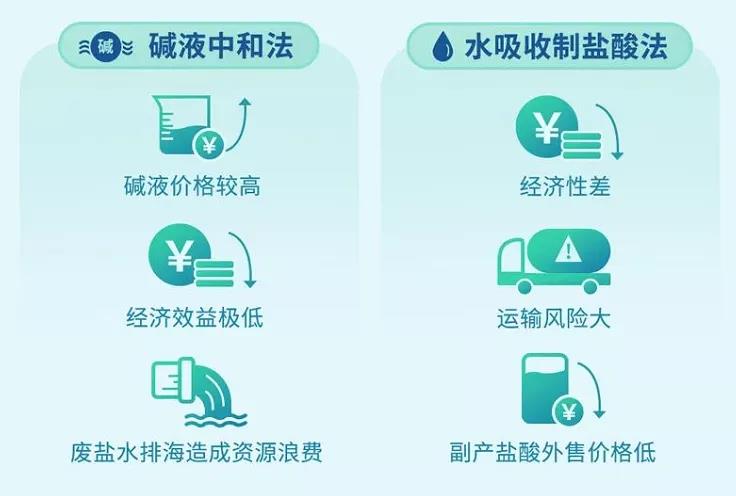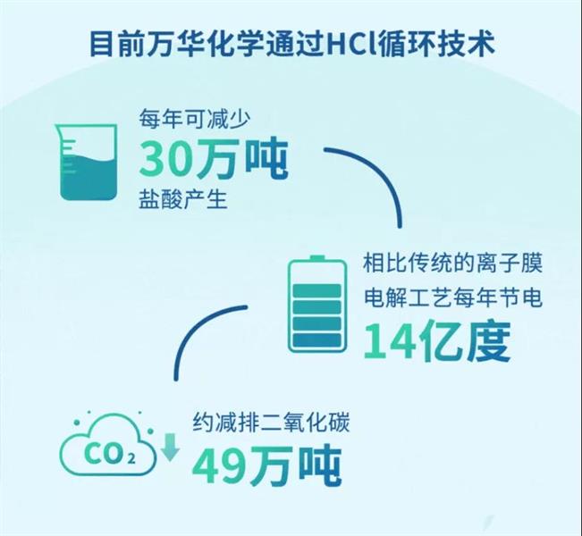 万华化学创新性HCI催化氧化技术实现了异氰酸酯生产过程中“氯”由开环消耗变为闭环循环。该技术采用世界首创的非贵金属催化剂及流化床工艺,在较温和条件下催化处理后直接转化,精制获得高纯氯气产品。该过程具有反应效率高、绿色环保、投资及运行成本低等优势。在以往生产异氰酸酯的过程中,氯元素只作为活性载体,最终全部以副产HCl形式产出。副产HCI无法直接利用,“氯”的利用率几乎为0。行业内处理副产HCI的通常方法是碱液中和法和水吸收制盐酸法。长期以来,副产HCI的处理问题成为制约行业发展的难题。通过HCl氧化反应将HCl转变为氯气循环利用,可构成原子经济反应体系,常见的技术为盐酸电解法、离子膜电解食盐水法以及催化氧化法。万华化学利用HCI绿色循环技术从根本上解决了耗氯行业副产盐酸附加值低、销售困难及环境污染等问题,同时为耗氯行业提供了更为经济、绿色的氯气原料来源。