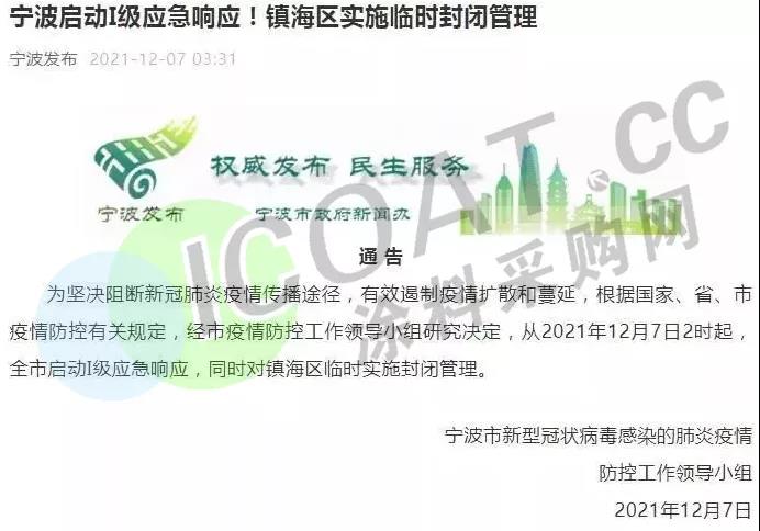 近日,浙江宁波镇海区报告3例新冠核酸检测阳性,“宁波发布”官方发布通知称,从2021年12月7日2时起,宁波全市启动I级应急响应,同时对镇海区临时实施封闭管理。