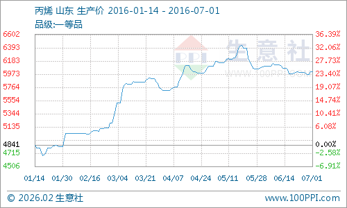 产品:本周国内丙烯市场重心窄幅上移。截止7月01日,山东市场价格在5850-6050元/吨。国际方面,本周丙烯外盘整体呈上涨趋势,截止到7月01日,FOB韩国成交在699美元/吨左右,CFR中国成交在736美元/吨左右。国内方面,本周丙烯厂家库存无压力,市场有回暖趋势。