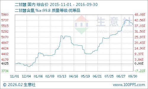 根据生意社监测的二甘醇样本走势图看到,9月二甘醇呈先涨后跌走势,样本整体均价从月初的5560.71元/吨涨至5595.71元/吨,小涨35元/吨,涨幅为0.63%。月中阶段最高涨至5747.14元/吨,最大涨幅为3.35%。月中后震荡回落,至月末有出现小幅反弹。