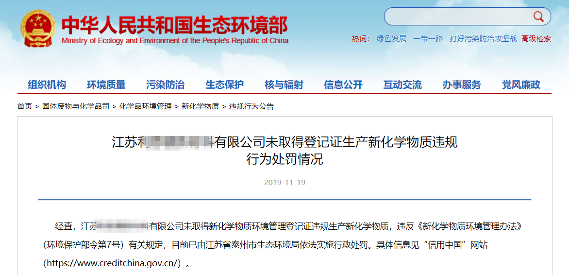 2019年11月20日,江苏、山东和济南三家企业因未取得新化学物质环境管理登记证违规生产新化学物质,违反《新化学物质环境管理办法》(环境保护部令第7号,以下简称“7号令”)有关规定,被生态环境执法机关处罚并公告。