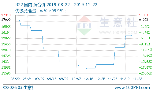 根据生意社价格监测,本周国内制冷剂R22出厂价格暂稳,11月18日主流生产厂家出厂报价均价16100元/吨,周末(22日)均价16100 元/吨,本周行情持稳,与去年同期同比下跌12.97%。