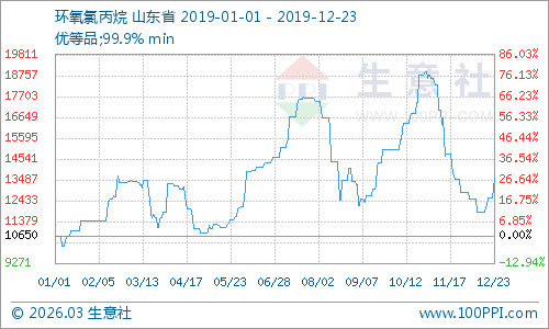 根据生意社监测的样本价格来看,2019年环氧氯丙烷市场价格震荡上行。截至到12月23日,环氧氯丙烷市场价格均价为13566.67元/吨,与年初报价的10650元/吨相比,报价上涨了2916.67元/吨,涨幅27.39%。