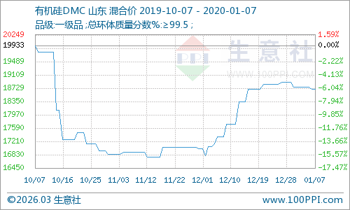 根据生意社监测数据显示,截止1月7日,数据监测的几个主流地区有机硅DMC市场报价均价为18700元/吨,与上月末(12月31日)相比,下幅下降70元/吨左右,下降幅度0.36%。