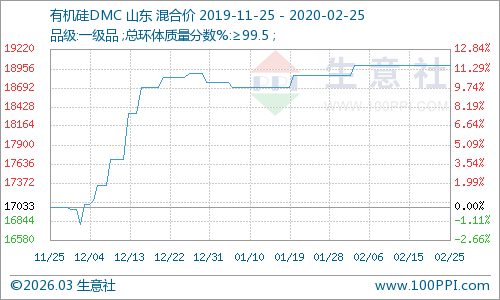 根据生意社监测数据显示,截止2月25日,数据监测的几个主流地区有机硅DMC市场报价均价为19000元/吨,目前市场运行平稳,报价波动不大。
